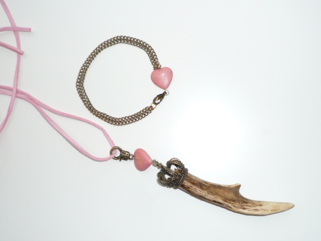 Hirschgeweih mit Kronenfassung und Rosa Steinherz an Rosa Lederband und passende Armkette