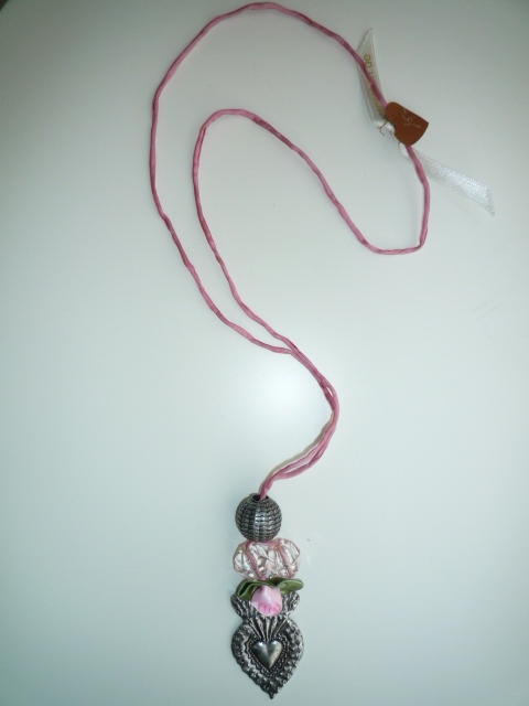 Silbernes Votivherz mit Satinblümchen an rose Seidenband