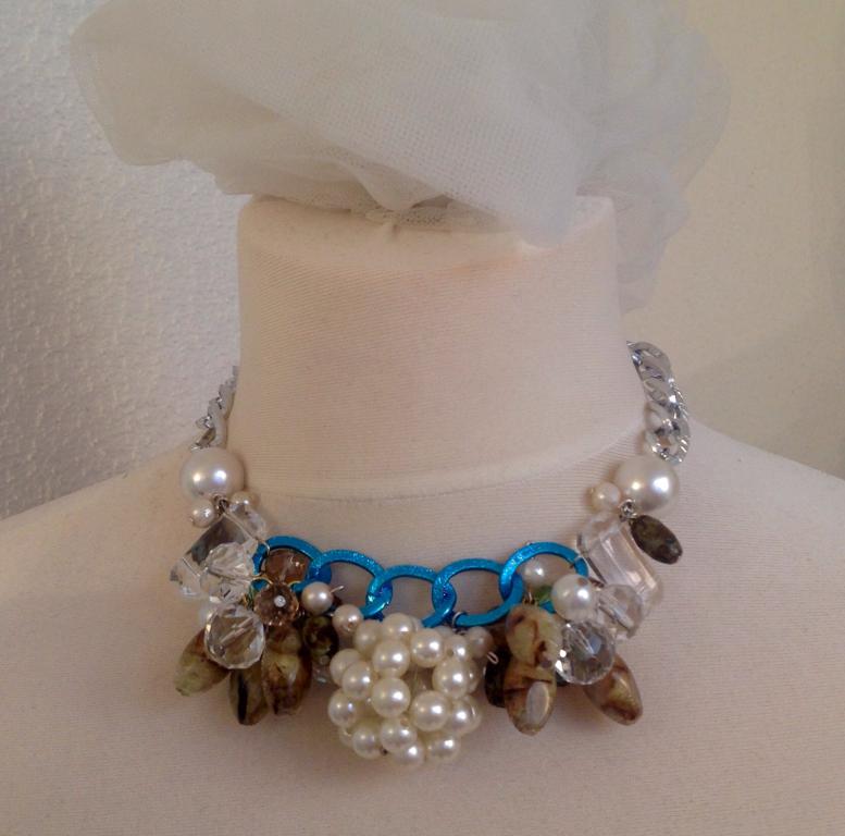 Statemenkette mit Kristallen,Perlen,antiken grünen Perlen und blauer Gliederkette sowie großer Perlenkugel