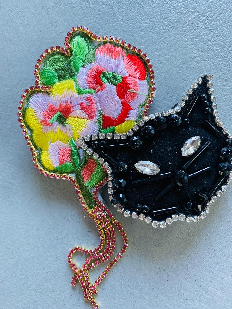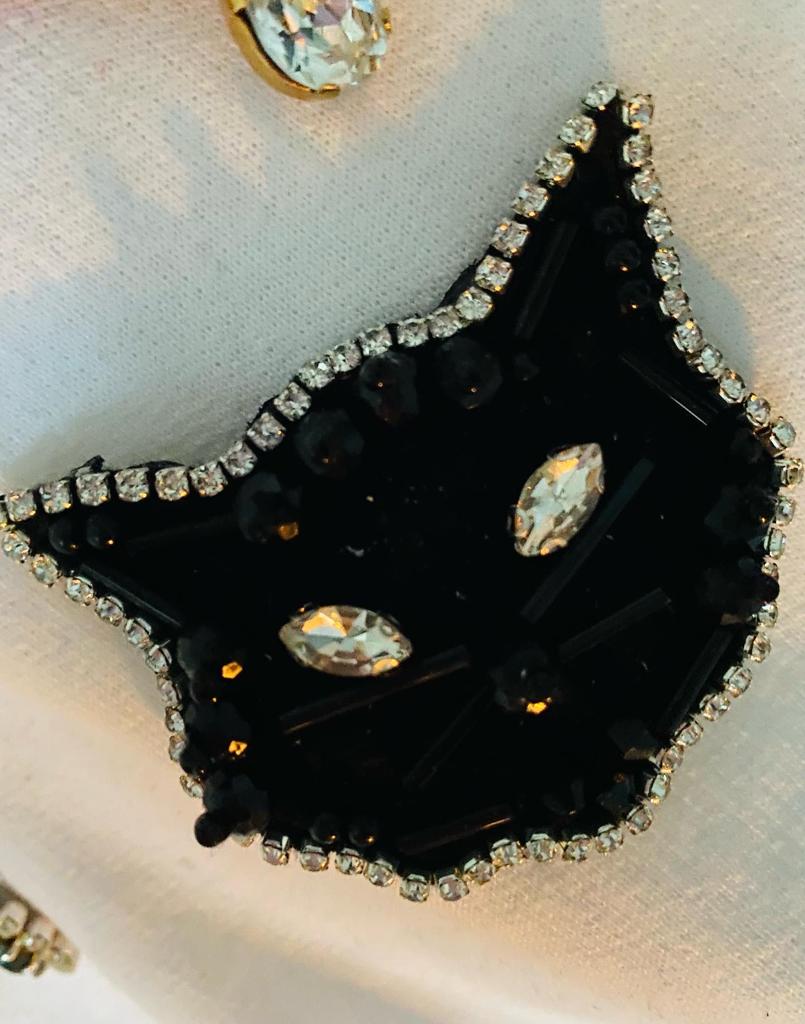 Brosche schwarze Katze bestickt mit Perlen und Strass