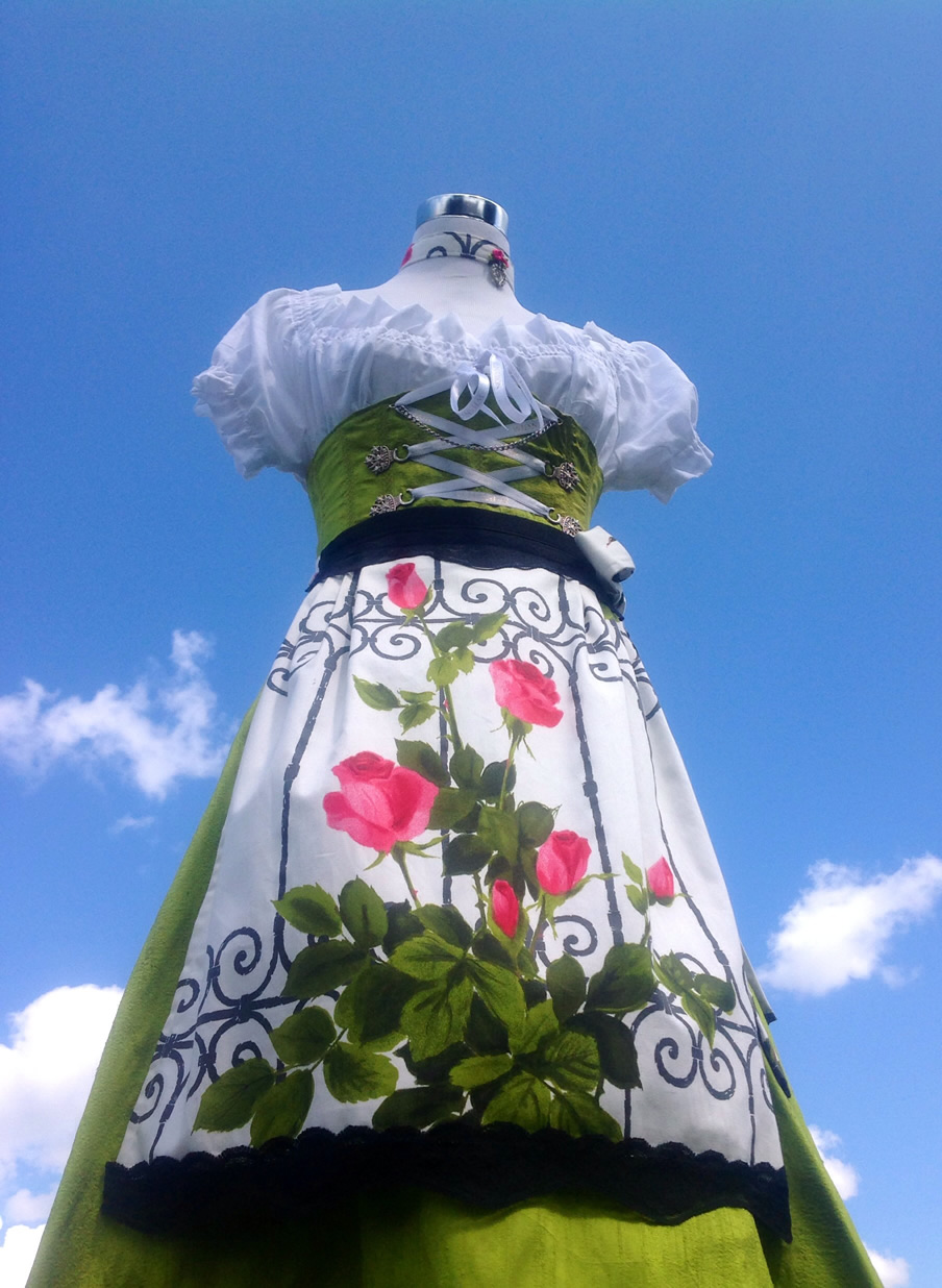 Hellgrünes Seidenmiederdirndl mit weißer Baumwollbluse mit kleinen Schmetterlingen und Rosendruck-Schürze mit schwarzer Spitze