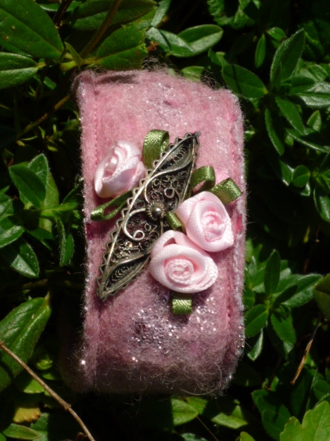 Rosa-silberschimmerndes Armband aus Walkstoff mit Silbereinschlüssen.Dieses glitzernde Unikat zeiren eine antikes,silbernes Trachtenmotiv und Satinrosen.Passend zur Dirndltasche aus meinem Sortiment.