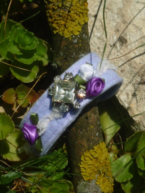 Fliederfarbenes Armband mit weißer Glitzerborte,Straßbrosche und Satinrosen.