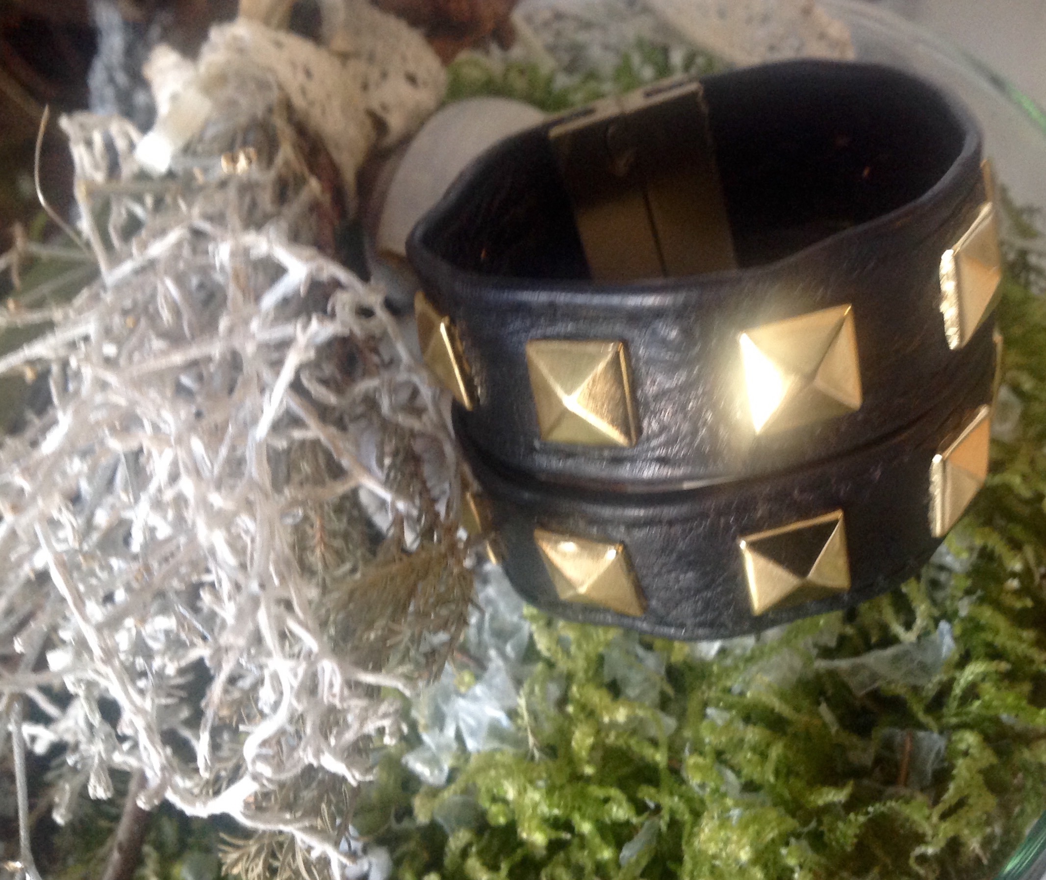 Zweireihiges Nietenarmband aus schwarzem Straußenleder mit Magnetverschluß im Valentinolook