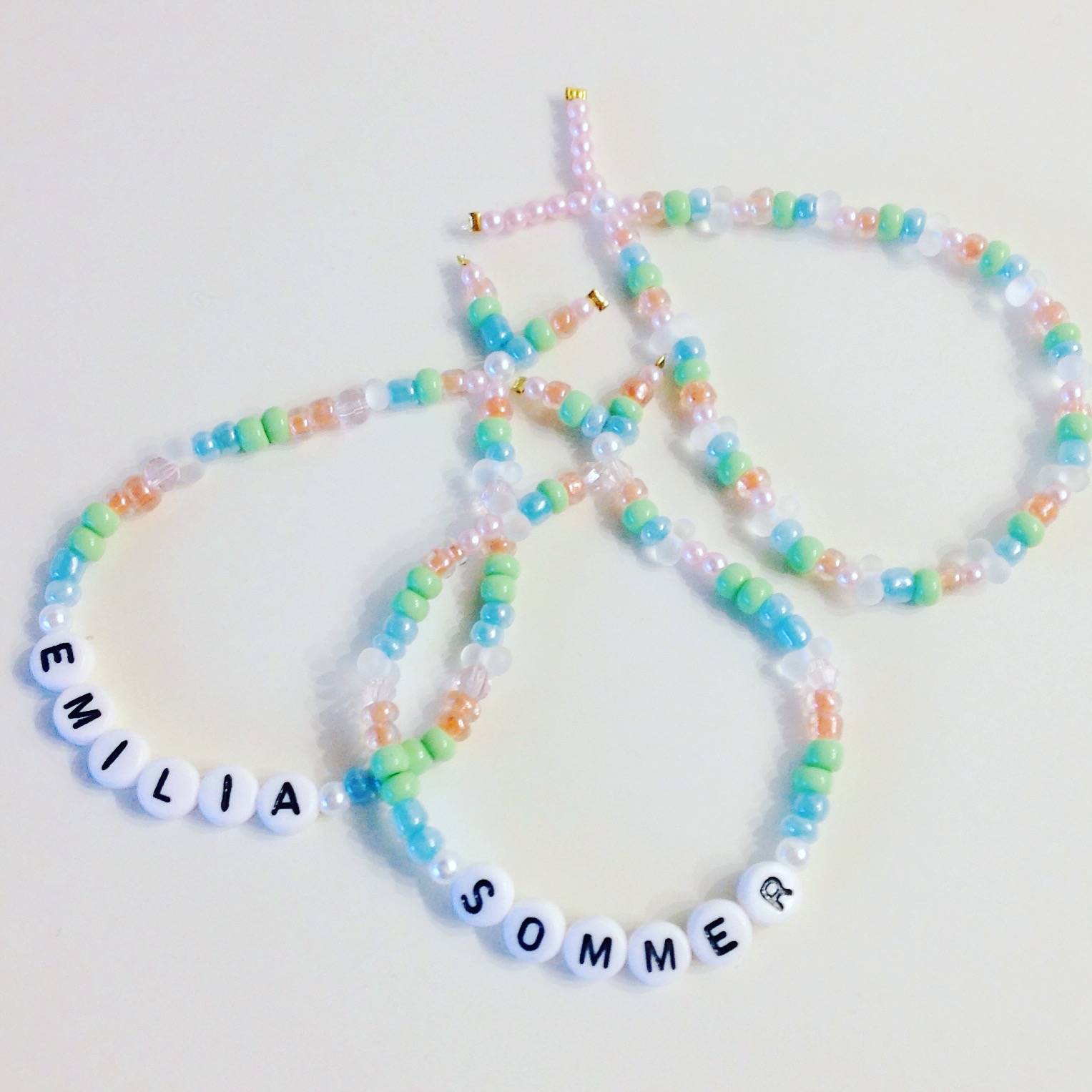 Perlenarmband in Pastelltönen werden auf Wunsch individuel mit gewünschtem Namen angefertigt.