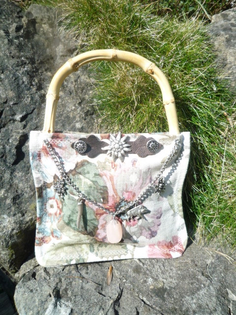 Dirndltasche aus Leinenblumenstoff mit echtem Bambusgriff.Dieses handgearbeitete Unikat ist mit einem Charivari mit Rosenquarz und Edelweißanhängern verziert.