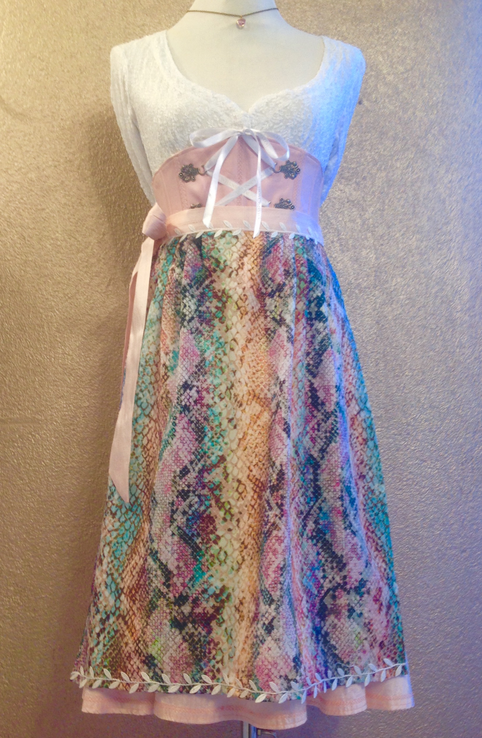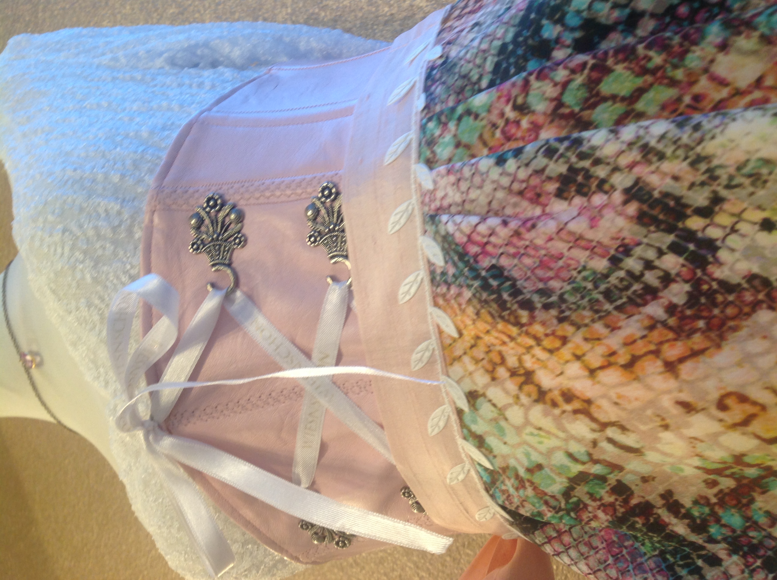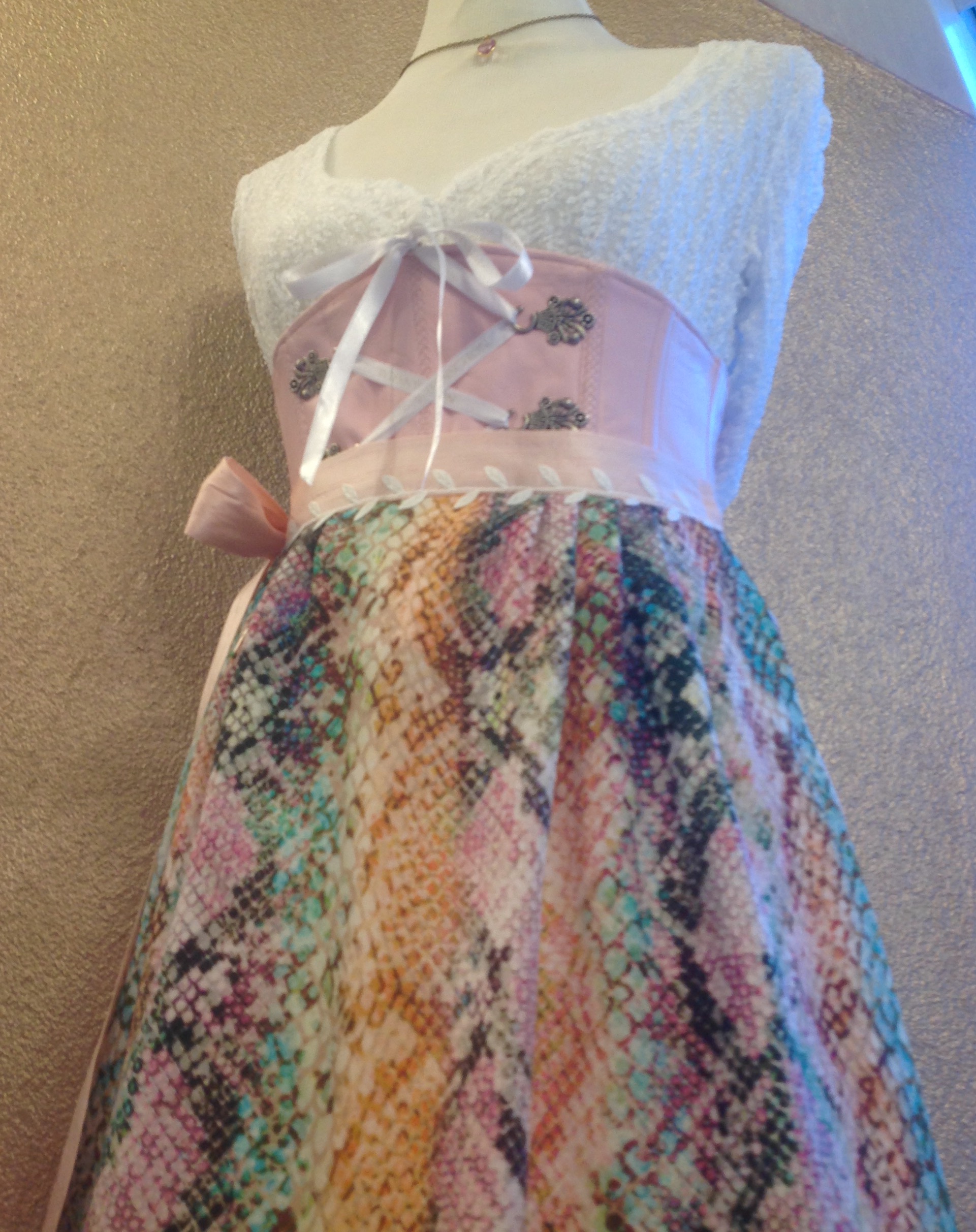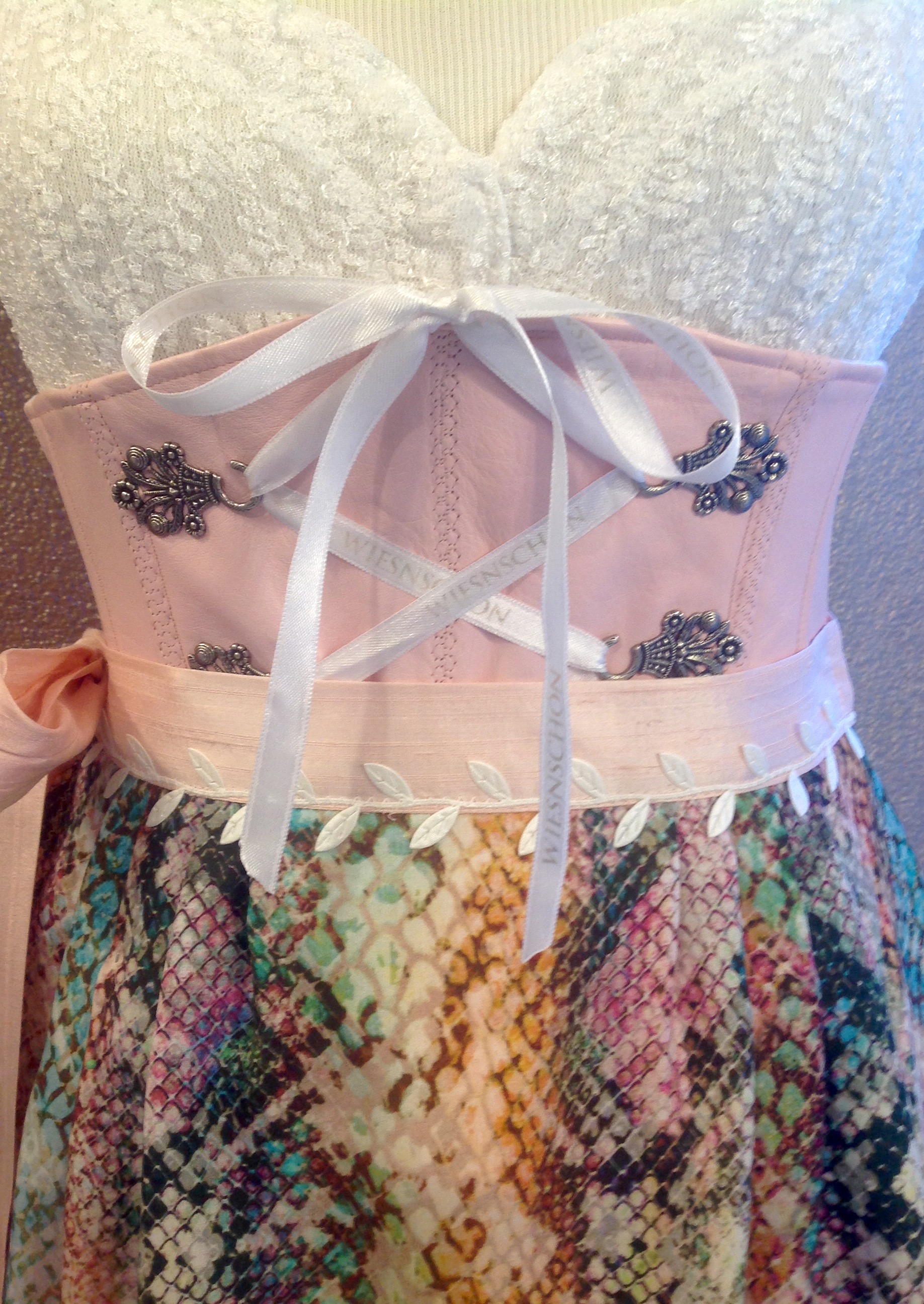 Ledermiederdirndl in rosé mit rosé Seidenrockcombiniert mit einer weißen Stretch-Spitzen -Dirndlbluse Modell Herzilein und einer Multicolor- Schlangen- Schürze .