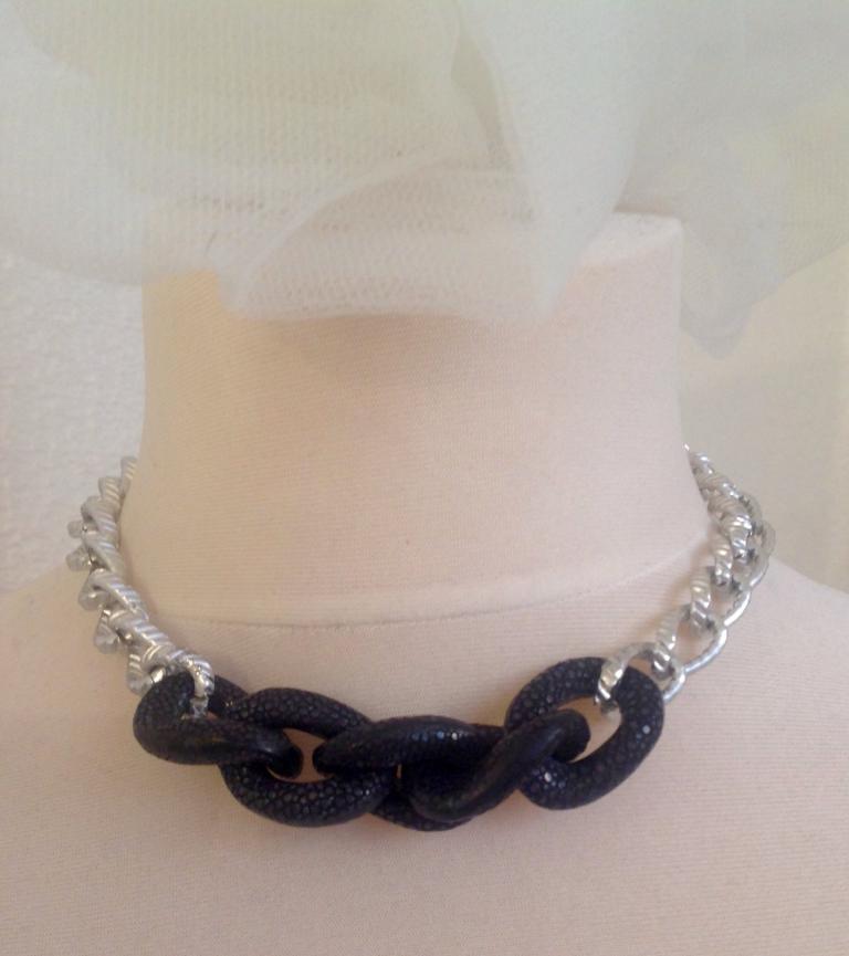 Kette combiniert aus Rochenledergliedern und silbernen Kettengliedern