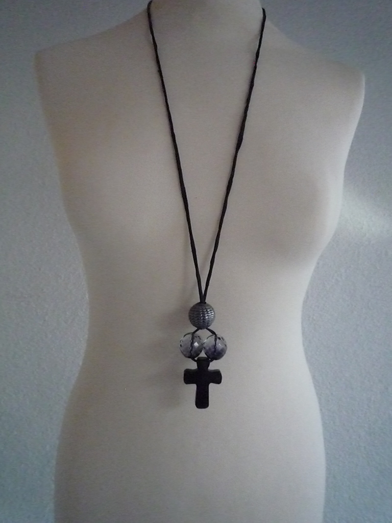 Schwarzes Steinkreuz am Seidenband mit altsilberner Kugel und Glasperlen.