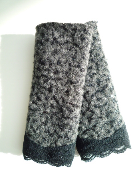 Graue Stulpen mit schwarzen Pailletten und schwarzer Spitze