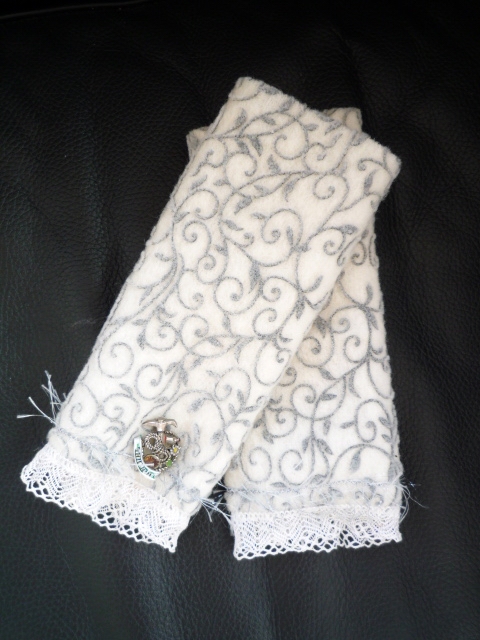 Wollweiße Stulpen mit grauer Musterung,alte Spitze und Trachtenmotiv
