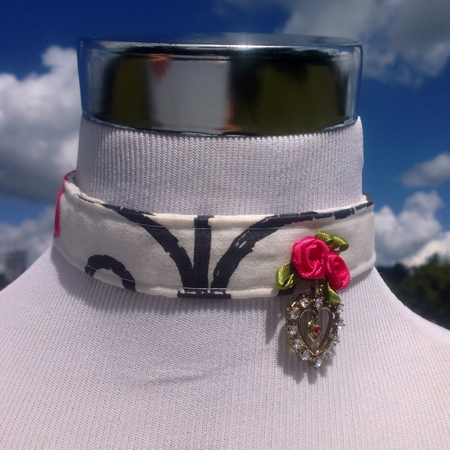 Kropfband in Weiß/Schwarz mit seitlichen pinkfarbenen Rosen und kleinem Straßherz. Durch Kettenverschluß regulierbar.