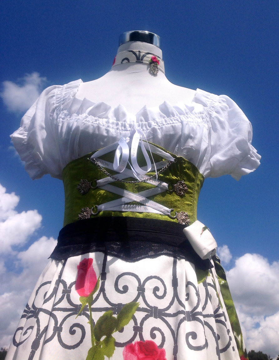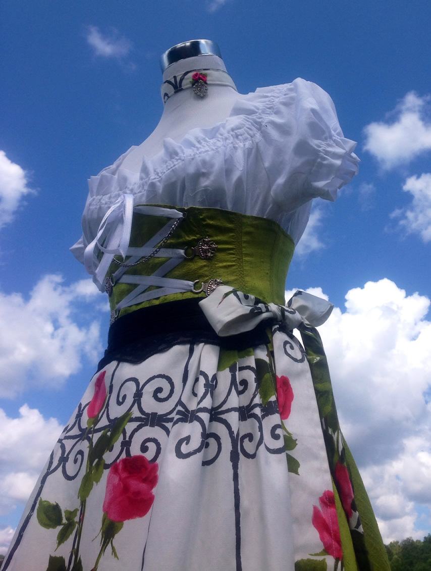Hellgrünes Seidenmiederdirndl mit weißer Baumwollbluse mit kleinen Schmetterlingen und Rosendruck-Schürze mit schwarzer Spitze